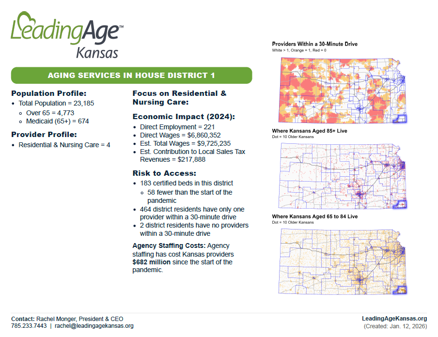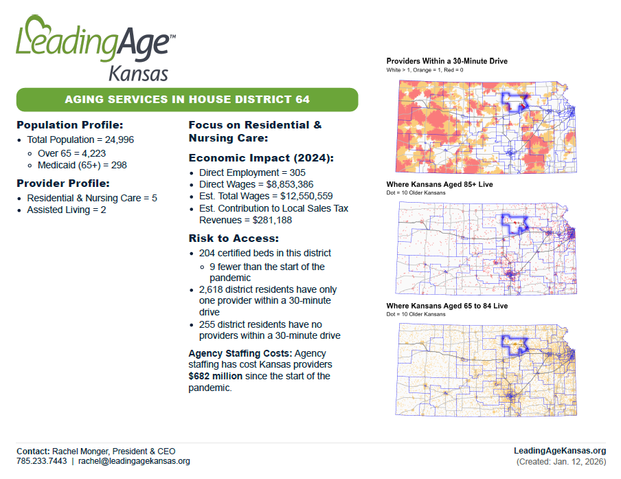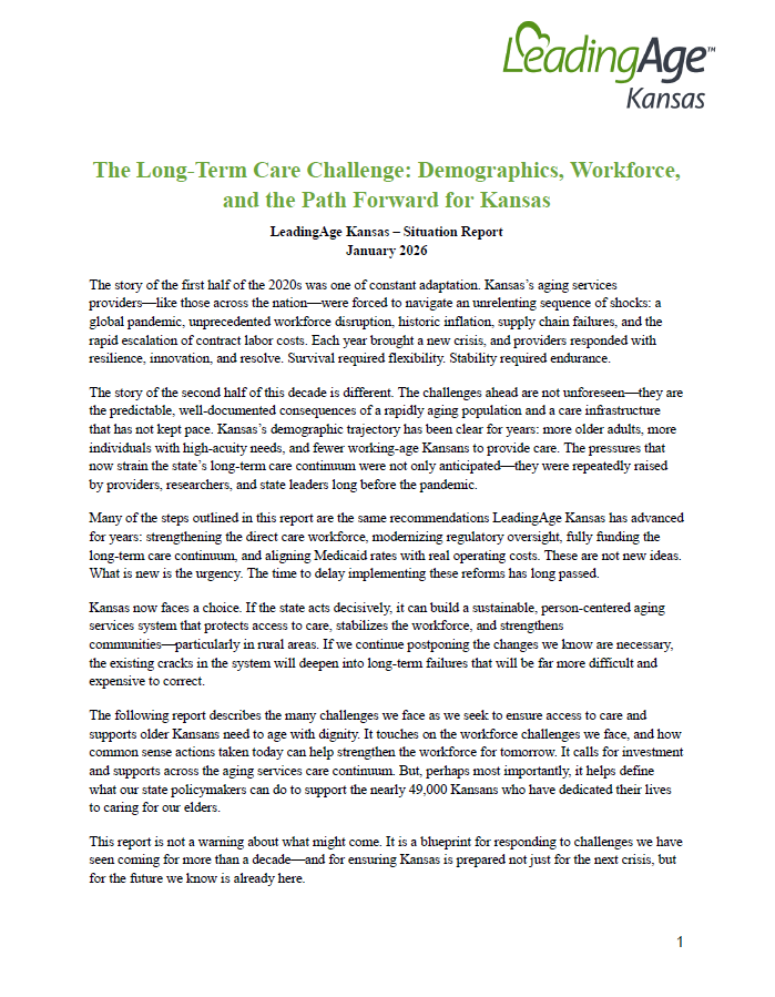 LeadingAge Kansas is dedicated to identifying strengths and needs for the full continuum of aging services in Kansas. We utilize the information gleaned from these reports to help formulate our legislative priorities each session. Learn more about the growing population of seniors, declining workforce, and policies impacting aging services by downloading our reports below.